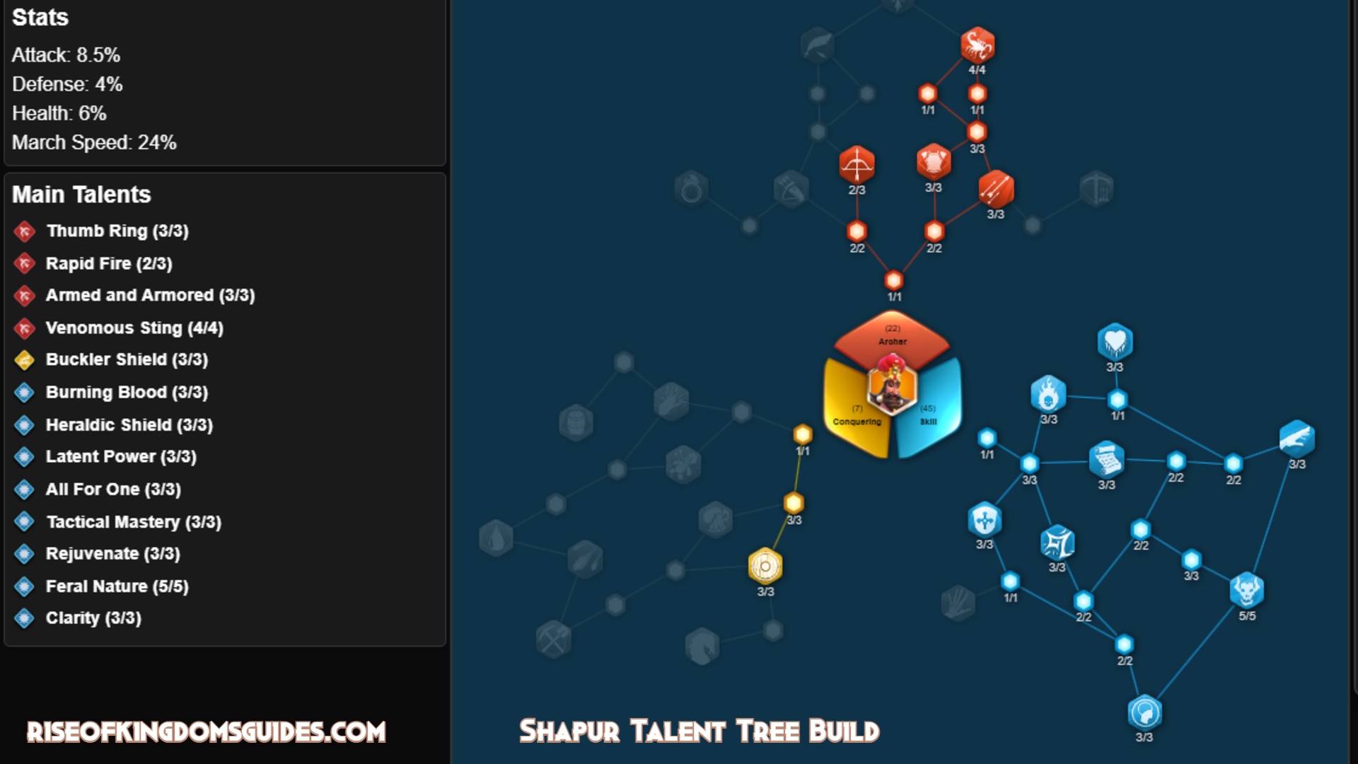 Shapur is an archer commander in Rise of Kingdoms with archer, conquering, and skill talent tree. Shapur is designed for rallying objectives, while for open field he is not that great. He is excellent for long rallies where you can apply a lot of DOT damage. On top of that, he is providing normal damage reduction, rage drain, march speed bonus, and health — all things that are crucial.